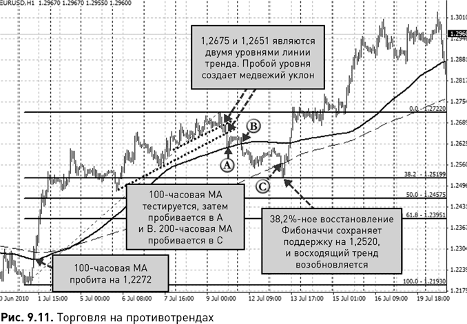 Например, на рис. 9.10 показан часовой график EURUSD. В левой части графика EURUSD начинает восходящий тренд после пробоя 100-часовой MA на уровне 1,2272. В районе 1,2272 следует осуществить покупку. Восходящее бычье движение подтверждается после пробоя 200-часовой MA, и восходящий тренд начинается всерьез.