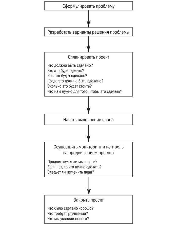 Реальные шаги в управлении проектами достаточно понятны. А вот их выполнение – не совсем. Рисунок 1.4 иллюстрирует эти шаги. В следующих главах подробно описывается каждый шаг. Сейчас приведем только краткое описание соответствующих процессов.