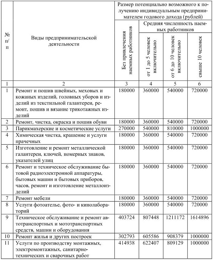 Размеры потенциально возможного к получению индивидуальным предпринимателем годового дохода, устанавливаемого в зависимости от средней численности наёмных работников