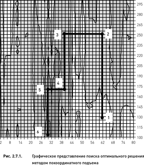 Простой по своей логике и легко реализуемый, метод покоординатного подъема, однако, не очень эффективен. Представим себе ситуацию, когда двумерная оптимизационная поверхность имеет оптимальную область в форме узкого «горного хребта», протянувшегося с «северо-запада» на «юго-восток». Если высота хребта повышается в «юго-восточном» направлении, то, применив этот алгоритм, мы выйдем на гребень хребта и не сможем найти улучшения, поскольку для этого надо будет менять два параметра одновременно. Это сильно ограничивает применимость данного метода.