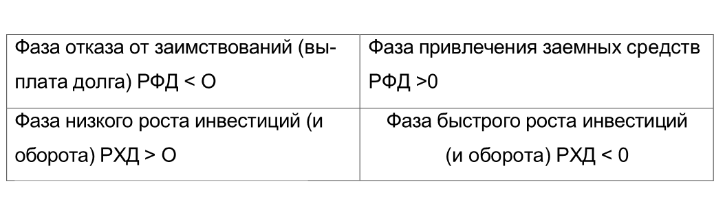 Таблица 4.1 – Связь изменения объема заимствований и инвестиций со знаками показателей РХД и РФД. /17/, с. 116 – 117
