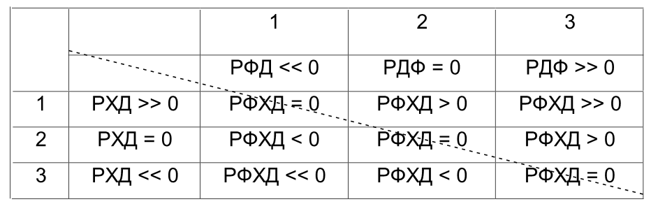 Знаки показателей РХД и РФД определяются выбранной стратегией развития, таблица 4.1.