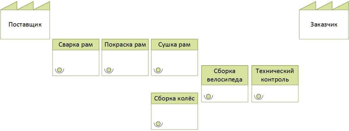 В качестве примера (см. рисунок 9.2) приводится процесс производства велосипедов. Как видно из рисунка, основные этапы этого процесса – сварка рам велосипедов, их покраска и сушка, сборка колёс, выполняемая параллельно упомянутым операциям (соответственно и расположена на карте), далее сборка велосипедов и технический контроль. Так в первом приближении выглядела бы карта потока производства определённой марки велосипеда.