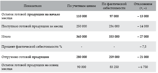 При использовании в качестве учетных цен нормативной (плановой) себестоимости необходимо по окончании месяца исчислять отклонение фактической производственной себестоимости продукции от стоимости ее по учетным ценам для распределения этого отклонения на отгруженную (проданную) продукцию и ее остатки на складах. С этой целью составляют специальный расчет с использованием средневзвешенного процента отклонений фактической себестоимости продукции от стоимости ее по учетным ценам.