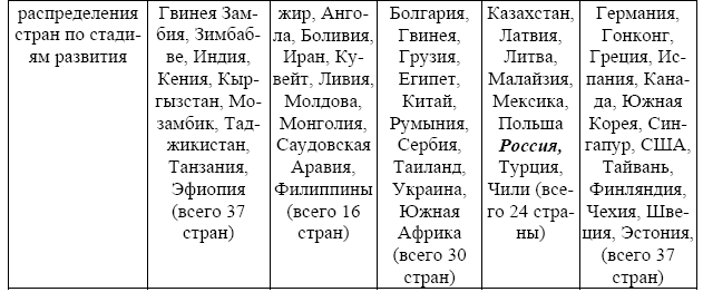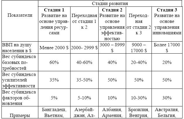 Отличительная особенность ИКР – оценка субиндексов на основе учета стадии развития страны. Это объяснялось существованием зависимости между уровнем развития страны и типом применяемых конкурентных стратегий, т. е. использованием тех факторов, которые обеспечивают стране преимущества. При этом на основе показателя уровня ВВП на душу населения выделялись три группы стран. Страны, развивающиеся 1) на основе ресурсов (менее 2000 $ на душу), 2) на основе эффективности производства (менее 3000 – до 9000 $ на душу), и 3) на основе инновационных факторов (более 17000 $ на душу). Чтобы учесть разную способность стран воспользоваться одинаковыми факторами, субиндексы агрегируются в сводный индекс с весами, зависящими от стадии развития страны.