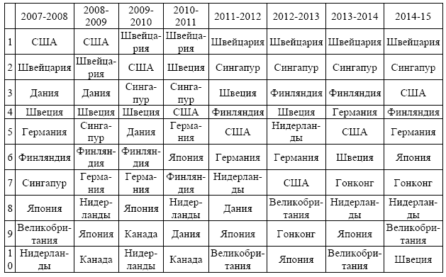Наиболее конкурентоспособными являются индустриально развитые страны, устойчиво занимающие на протяжении двух десятилетий верхнюю часть рейтинга при доминировании европейских стран (таблица 7.5). Шестой год подряд рейтинг возглавляет Швейцария. Ежегодно и ста-биль высокие результаты демонстрируют Финляндия, Германия, Великобритания, Нидерланды. Правда, значительно упал рейтинг Швеции и особенно Дании. Второе место в рейтинге, причем четвертый год подряд, занимает Сингапур. Лидерство США было прервано кризисом 2008-09 гг., но в 2014 г. они снова вошли в тройку лидеров. Стабильно повышает свой рейтинг Гонконг.