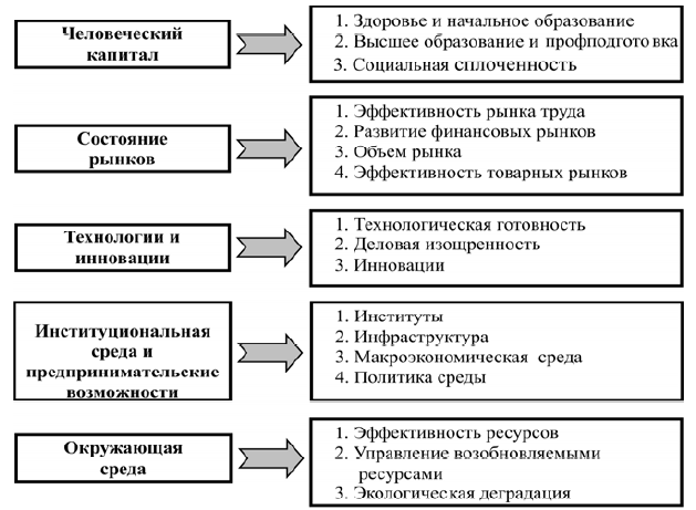 1) главенства законов, 2) политической и макроэкономической стабильности, 3) конкуренции на рынках. Блок усилителей эффективности соответствует инвестиционной стадии развития, где конкурентоспособность достигается за счет интеграции национальной экономики в мировую через заимствование технологий и привлечение иностранных инвестиций. На этой стадии внимание должно уделяться 1) состоянию рынков, 2) инфраструктуры и 3) вопросам открытости экономики (валютный и таможенный режим). Блок факторов развития характеризует страны, находящиеся на «инновационной стадии» развития. Эти страны совершили переход от экономики, импортирующей технологии, к экономике, создающей их. Их задача – создать условия для повышения качества предпринимательства и поддержания высоких темпов инноваций за счет 1) поощрения инвестиций в НИОКР, 2) совершенствования материальной базы производства, 3) накопления человеческого капитала.