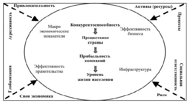 Существенное влияние на уровень конкурентоспособности страны оказывает господствующая в обществе система ценностей. Она может предполагать тяжелый труд, дисциплину и лояльность ради достижения общих целей, как было в Японии 60-х и характерно для Южной Кореи сегодня. Система ценностей может быть ориентирована на повышение благосостояния, когда, продолжая упорно трудиться, люди больше внимания уделяют условиям формирования их собственных доходов, например, в Сингапуре. В 60-е годы в Европе и США на смену этике «тяжелого труда» пришла этика социального участия, отличавшаяся вовлеченностью граждан в решение вопросов социального устройства общества, что стало основным элементом системы ценностей для Японии в настоящее время. Для США и Европы сегодня система ценностей связана с самовыражением – реализацией личных достижений. Так как система ценностей изменяется в процессе развития страны, то это означает, что при разработке политики по совершенствованию конкурентной среды необходимо учитывать специфику системы ценностей общества, а эффективность политики (рост конкурентоспособности страны) будет зависеть от ее соответствия этой системе.