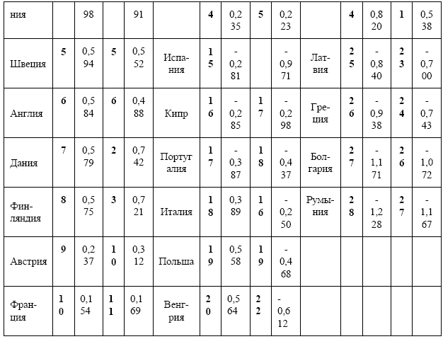 В Европейском Союзе рассчитывается Индекс конкурентоспособности регионов (EU Regional Competitiveness Index – RCI) с целью определения уровня их развития на основе сравнительного анализа. Регион понимается как кластер, а его конкурентоспособность трактуется как способность генерировать высокий и растущий доход, а также улучшать уровень жизни населения региона. Индекс рассчитывается по той же методологии, что и Индекс глобальной конкурентоспособности – суммирование значений субиндексов, взвешенных с учетом стадии развития, и почти с тем же набором показателей (таблица 7.9), но определяемых при помощи существенно меньшего количества индикаторов. В окончательном виде он превращается в базу для расчета Индекса и Рейтинга конкурентоспособности стран Евросоюза (EU Country Competitiveness Index – CCI) (таблица 7.10).