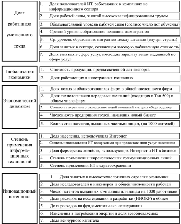 В США Фонд информационных технологий и инноваций (Information Technology and Innovation Foundation) при поддержке Фонда предпринимательства Кауффмана (Kauffman Foundation of Entrepreneurs) с 1999 года (2002, 2007, 2008, 2010, 2012, 2014) составляет рейтинг штатов на основе Индекса «Новой экономики» (The State New Economy Index). Определяющие признаки «новой экономики» – это: 1) доля занятых умственным трудом (инженеры, управленцы, исследователи, высококвалифицированные работники); 2) глобальный характер деятельности (степень включенности в мировое хозяйство через экспорт импорт); 3) экономический динамизм (способность быстро приспосабливаться к изменениям на мировых рынках); 4) массовое применение информационных технологий; 5) инновационный потенциал, (экономический рост на основе инноваций).
