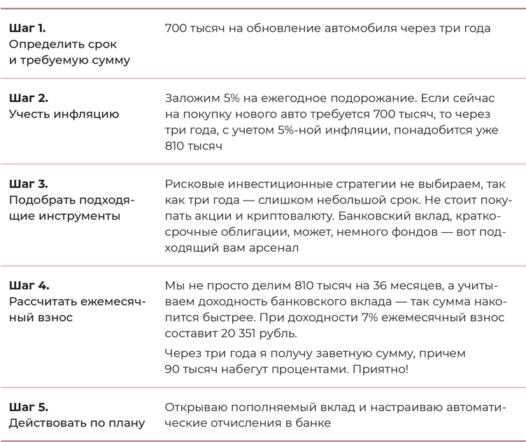 Отпуск на Майорке следующим летом, новенький MINI Cooper через год, первый взнос на «двушку» в Ясеневе или второе высшее по психологии. Если срок небольшой и сумма понятна, можно использовать такой алгоритм.