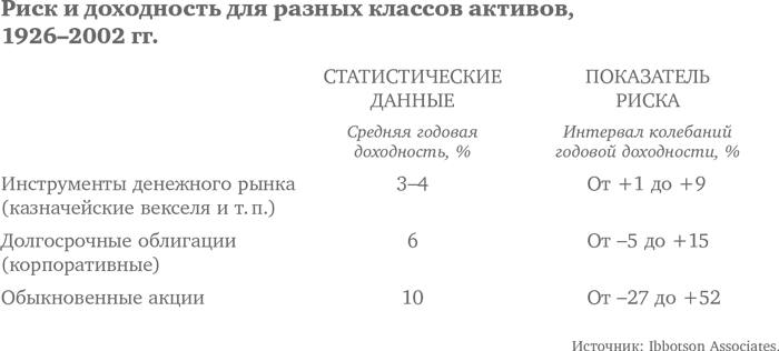 В таблице приведены данные о соотношении риска и доходности на рынках США за 75-летний период. Недвижимости в этой таблице нет, потому что отсутствуют сопоставимые данные за этот отрезок времени. В те периоды, информация по которым доступна, доходность недвижимости не отличалась от доходности обыкновенных акций. Самую высокую доходность демонстрируют обыкновенные акции – около 10 %. Этот показатель учитывает как дивиденды, так и прирост капитала, отражающий повышение прибыли компании и рост дивидендов. Однако высокая доходность акций связана со значительной неустойчивостью, служащей хорошим показателем риска. В некоторые годы акции теряли более четверти своей стоимости. Известны случаи, когда отрицательная доходность фиксировалась три года подряд, например в 2000–2002 гг.
