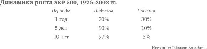 К счастью, рынок акций большей частью все-таки растет. Взяв показатели доходности рынка за пяти- и десятилетние периоды, мы видим движение вверх – даже в десятилетие, завершающееся 2002 г. В большинстве десятилетних периодов акции демонстрируют более высокую доходность, чем облигации (хотя облигации были более доходными в десятилетие, завершившееся в 2002 г.). Тем не менее, если вам нравится более высокая доходность рынка акций, приготовьтесь к тому, что время от времени вам придется терпеть значительные убытки.