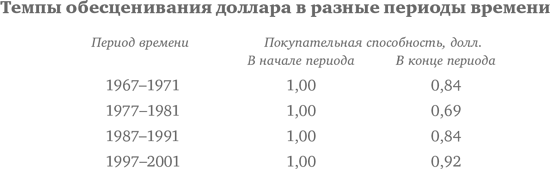 Наиболее безопасны – с точки зрения колебаний цен – вложения в инструменты денежного рынка. Даже в периоды очень низких процентных ставок такие вложения не приносят убытка. Но и они сопряжены с определенным риском. «Инфляция» – вот термин, который используется для обозначения риска, присущего всем финансовым инструментам, даже монетам и банкнотам. Попросту говоря, это означает, что покупательная способность денег непостоянна. На протяжении довольно долгого периода покупательная способность доллара непрерывно падает. Как видно из приведенной ниже таблицы, темпы обесценивания доллара очень непостоянны.
