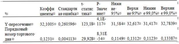 В таблице 2.4 представлены коэффициенты уравнения регрессии и оценки их статистической значимости. При этом в разделе Коэффициенты цифра 32,10052 слева от Y-ПЕРЕСЕЧЕНИЕ в формуле линейного тренда: Y=AX+С обозначает исходный уровень (его также называют свободный член или константа), то есть дает числовое значение буквы С. А вот коэффициент 0,123085 слева от независимой переменной «Порядковый номер торгового дня» дает числовое значение буквы A в формуле линейного тренда.