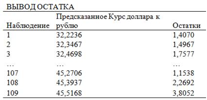 Результаты решения уравнения регрессии, которые в программе Excel даются в виде единой таблицы под заголовком ВЫВОД ИТОГОВ, у нас представлены в виде четырех блоков (см. таблицы 2.2,2.3, 2.4 и 2.5). Так, в таблице 2.2 сгенерированы результаты по регрессионной статистике; в таблице 2.3 дается дисперсионный анализ; в таблице 2.4 оценивается статистическая значимость коэффициентов регрессии; а в таблице 2.5 даются найденные по данному уравнению регрессии расчетные значения курса доллара yрасчет и остатки.