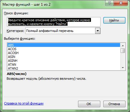Второй способ. Нужно навести курсор на ту же пустую ячейку (ячейка D2). Потом надо щелкнуть левой кнопкой мышки иконку ФОРМУЛЫ, расположенную вверху рабочего листа Excel, а затем щелкнуть появившуюся иконку Fx. После этого на экране возникнет диалоговое окно МАСТЕР ФУНКЦИЙ, в котором внизу надписи ВЫБЕРИТЕ ФУНКЦИЮ: остается только выбрать функцию ABS ? см. рис. 2.3.