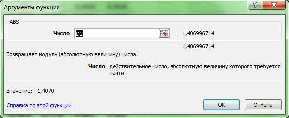 В результате появится окно АРГУМЕНТЫ ФУНКЦИИ ABS – см. рис. 2.4. Сразу после этого надо навести курсор мышки на ячейку с численным значением остатка для наблюдения 1 (ячейка D2), равное 1,4070. Это нам, как и при первом способе работы с функцией, позволит получить тот же результат ABS(1,4070)= 1,4070.