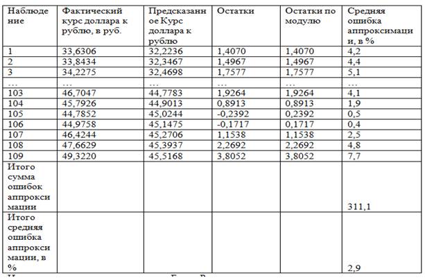 Чтобы найти среднюю ошибку аппроксимации (в %) для каждого наблюдения надо относящийся к нему «Остаток по модулю» поделить на «Фактический курс доллара к рублю», а полученный результат умножить на 100. Так, для наблюдения 1, «Средняя ошибка аппроксимации»= 1,4070/33,6306*100=4,2%.