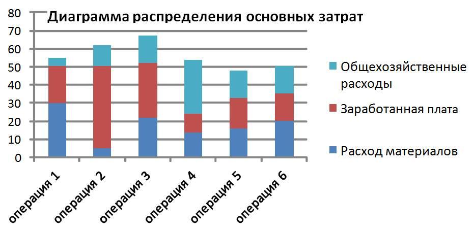 В случае недостатка или отсутствия необходимых для проведения анализа данных всегда можно оценить влияние каждой операции экспертно, в определённых долях относительно друг друга, для чего можно воспользоваться уже описанными выше инструментами: матрицами сравнения и таблицами отбора, но следует помнить, что погрешность такой оценки будет выше. Итогом анализа должен стать перечень операций с направлением снижения затрат, в приведённом на рисунке примере мы имеем раскладку по трём видам основных статей затрат, применительно ко всем операциям потока (в нашем случае их шесть).