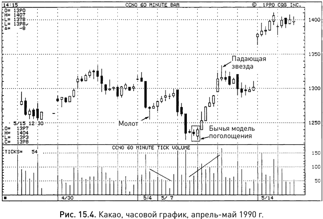 Это можно увидеть, в частности, по часовому графику, представленному на рисунке 15.4. После появления бычьей свечи «молот» в конце торговой сессии 4 мая цены пошли вверх на фоне падения тикового объема, что стало первым признаком неуверенности покупателей. Вторым тревожным сигналом служили короткие белые тела свечей. Позже, 8 мая, в первые три часа торгов наблюдалось стремительное падение, в ходе которого были достигнуты новые минимумы. Однако во второй половине этого дня движение цен уже указывало на крайне низкую вероятность продолжения утреннего спада: вслед за длинной черной свечой третьего часа торгов возникла дожи, из этих двух свечей сложился крест харами, а еще чуть позже появилась свеча с белым телом, поглотившим два предшествующих черных тела, т. е. сложилась бычья модель поглощения. Минимумы этой свечи, а также длинной черной свечи, возникшей ранее, еще и образовали основание «пинцет».