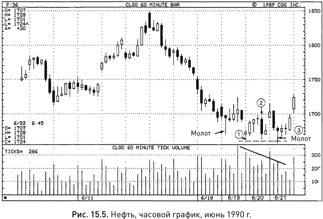 На рисунке 15.5 молот от 19 июня предупредил о том, что рынок нащупывает основание. В первый час торгов 20 июня цены достигли новых минимумов на отметке $16,62, отмеченной цифрой 1, а тиковый объем в этот момент подскочил до 324 сделок. Спустя несколько часов произошло еще одно движение к минимумам и образовалась длинная черная свеча, помеченная цифрой 2, но на этот раз тиковый объем составил лишь 262 сделки. Сессию следующего дня, 21 июня, можно отнести к числу самых интересных. В течение третьего ее часа наблюдалось падение до новой минимальной отметки $16,57, и этому сопутствовал еще более низкий тиковый объем, чем в предшествующие два раза, – всего 249 сделок. Все говорило о том, что напор продавцов ослабевает. Уже к концу этого часа цены спружинили вверх и образовали на графике молот (из главы 11 вы знаете, что теперь следовало ожидать повторной проверки недавнего максимума, а именно отметки $17,24).