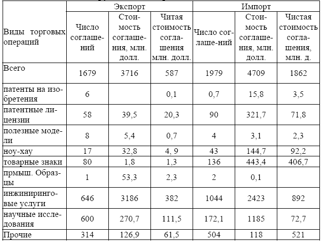 Одной из разновидностей рыночных отношений в инновационной сфере является лицензионная деятельность, бурное развитие которой наблюдается в послевоенный период Патентно-лицензионный обмен особенно характерен для ведущих индустриальных стран. Более 90 % мирового патентно-лицензионного обмена приходится на 11 стран. Крупнейшим мировым лицензиаром являются США, на долю которых приходится свыше половины общей суммы доходов. Крупнейшим покупателем лицензий остается Япония. Для Японии характерен динамизм патентно-лицензионного обмена. Крупными лицензиарами являются ФРГ, Англия, Италия. Объёмы продаж инновационной продукции России с зарубежными странами показаны в табл. 4.3.