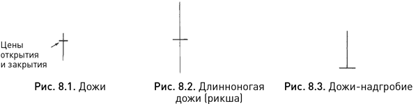 Как говорилось в главе 3, дожи представляет собой свечу с одинаковыми ценами открытия и закрытия (варианты дожи вы найдете на рис. 8.1–8.3). Свечи этого типа являются настолько значимыми сигналами разворота, что мы посвятим целую главу различным их проявлениям. Ранее мы уже рассматривали дожи в качестве составной части свечных моделей, а именно звезды дожи (см. главу 5) и креста харами (см. главу 6)