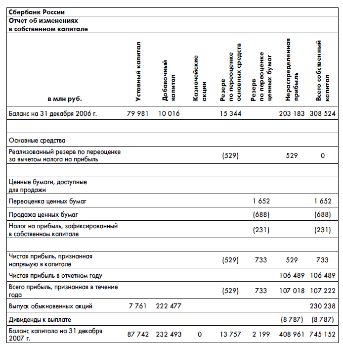 Также из отчета об изменениях в собственном капитале можно увидеть, что в 2007 г. у Сбербанка образовались нереализованные резервы (потенциальная прибыль) в размере 733 млн руб. от переоценки его портфеля ценных бумаг для продажи.