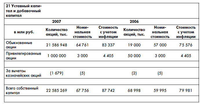 Итак, из отчета об изменениях в собственном капитале четко видно, что уставный капитал Сбербанка составляет 87,7 млрд руб., добавочный капитал – 232,5 млрд руб. Причем в 2007 г. уставный капитал был увеличен за счет выпуска дополнительных акций. Далее в финансовой отчетности Сбербанк расшифровывает эти цифры и поясняет состав своего акционерного капитала: