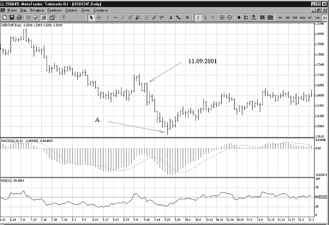 Рис. 83. График курса доллар / швейцарский франк, период – один день. Простейшие технические индикаторы не предсказали теракт 11.09.01 в Нью-Йорке, хотя вскоре курс доллара все-таки пошел вверх