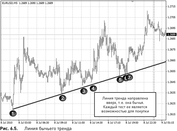 На рис. 6.5 EURUSD имеет повышающиеся минимумы, что говорит о наличии бычьего тренда. Соединение точек 1 и 2 образовало линию восходящего тренда. На этом графике покупатели входили на рынок на падениях, которые приближались, или тестировали линию тренда в точках 3–7. Всякий раз рынок отскакивал от этой линии. Каждый тест давал трейдерам возможность торговать с низким риском.