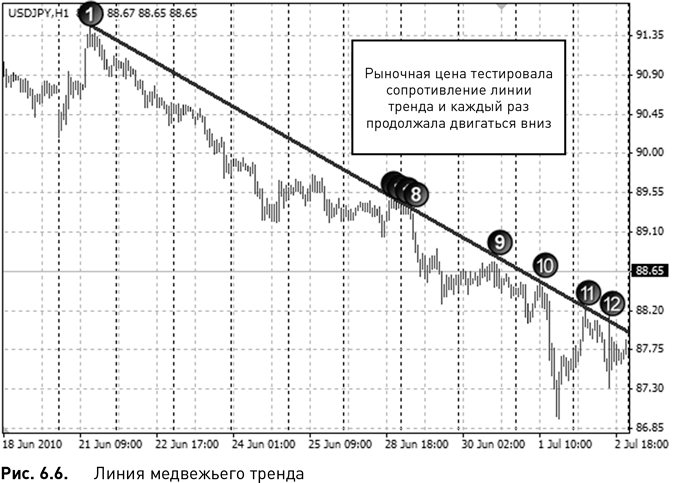 На рис. 6.6 USDJPY находится в нисходящем тренде и видно, что понижающиеся максимумы создают линию тренда. Это медвежья линия тренда. Главная линия тренда тестировалась не меньше 12 раз по мере развития движения вниз. Каждый тест этой линии давал возможность трейдерам продавать или оставаться на тренде с низким риском.