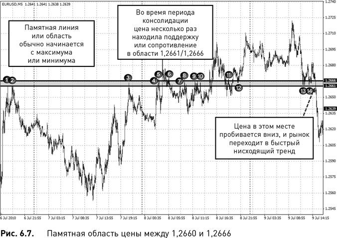 Наконец, в точках 13 и 14 рынок попытался уйти вверх от памятной линии, но не смог набрать восходящий моментум после двух похожих движений по 20 пипсов. Когда рынок не смог совершить вторую попытку восходящего движения, созрели условия для быстрого движения вниз. Умные трейдеры внимательно следят за этими приливами и отливами, когда рынок находится в состоянии консолидации, и используют памятную цену или область как граничную линию, разделяющую бычий или медвежий уклон. Когда цена прорывается, они ожидают резкого движения и действуют соответственно.