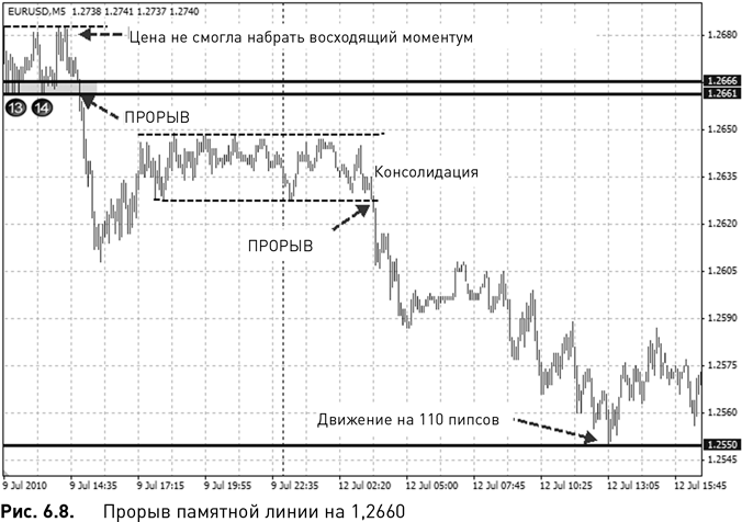 Рис. 6.8 показывает поведение цены после падения ниже уровня 1,2660. Трендовое движение привело к падению с 1,2660 до 1,2550, т. е. на 110 пипсов. Памятные линии подают ценные сигналы для торговли.