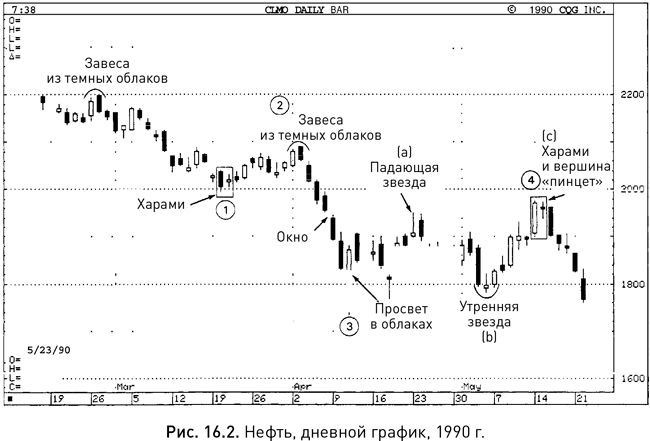 Любопытно, что при разложении этой волны на более мелкие волновые движения тоже можно видеть подтверждающие свечные сигналы. Так, при завершении волны (а) образовалась падающая звезда, максимумы которой соответствовали границам окна, открытого в начале апреля. Затем утренняя звезда в конце волны (b) указала на разворот в основании, и, наконец, конечная точка волны (с) оказалась гребнем большой волны 4 с сопутствующими ей медвежьими сигналами – крестом харами и вершиной «пинцет».