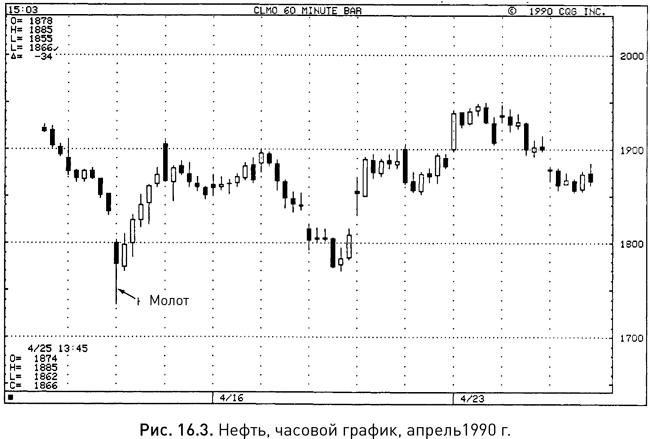 Ход торгов 11 апреля, когда и появился соответствующий сигнал, иллюстрирует часовой график на рисунке 16.3. Во время первого часа снижение доходило до $1 по сравнению с ценой предыдущего закрытия, и в этот момент казалось, что ему не будет предела. Однако ранок нащупал опору у отметки $17,35, которая очень близка к рассчитанной нами цели в $17,6. На графике при этом сформировался классический молот – бычий индикатор, а сразу за ним последовала серия свечей с длинными белыми телами. Таким образом, молот и эти свечи подтвердили окончание волны 3 на часовом графике, а на дневном (см. рис. 16.2) возник другой сигнал разворота в основании – модель «просвет в облаках», образованная свечами от 10 и 11 апреля.
