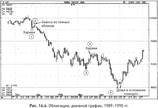 На рисунке 16.3 пятиволновое падение началось в конце декабря у отметки $100,16. В основании волны 1 возникла модель «харами», а гребень волны 2 представлял собой завесу из темных облаков. Волна 3 не сопровождалась какими-либо свечными индикаторами, а волна 4 увенчалась харами. Самой интересной оказалась пятая, завершающая волна. Цель движения цены для нее рассчитывается путем умножения высоты третьей волны на коэффициент Фибоначчи, и в данном случае она составляла $88,08. В конце апреля цены достигли минимума в $88,07, при этом от свечей поступил мощный бычий сигнал в виде основания «пинцет» из двух дожи. Достижение основания подтверждалось, кроме того, динамикой объема торгов – мы обсуждали это в главе 15, когда рассматривали рисунок 15.1.