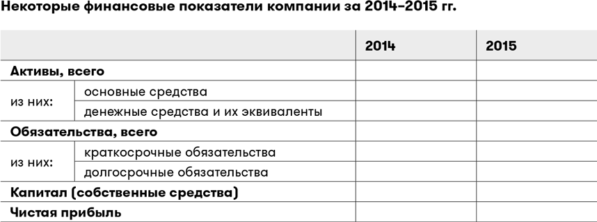 На с. 7 находим первую таблицу. Она называется «Консолидированный отчет о финансовом положении» и представляет собой бухгалтерский баланс предприятия. Для того чтобы показать изменения финансового положения, всегда приводятся показатели за отчетный и за предыдущий год. В нашем случае это 2015 и 2014 гг. Из таблицы на с. 7 мы переписываем в свою таблицу всего семь цифр за 2015 г. и семь цифр за 2014 г.: