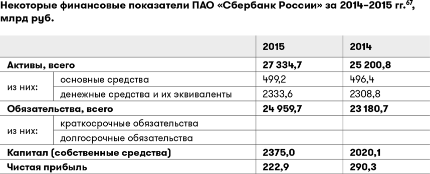 Даже не зная, что Сбербанк является крупнейшим банком Российской Федерации, отделениями которого покрыта вся территория страны, в нашей таблице мы видим, что это очень крупная компания, чьи активы составляют 27 334,7 млрд (27,3 трлн) руб. Стоимость только основных средств компании (здания, банкоматы, компьютеры, информационные системы и многое другое) составляет 499,2 млрд руб. Очень важный показатель – сколько собственных денег и денежных эквивалентов имеет Сбербанк. Это огромная сумма в 2333,6 млрд (2,3 трлн) руб. Причем по сравнению с 2014 г. она увеличилась на 24,8 млрд руб. Сбербанк явно не испытывает проблем с деньгами.