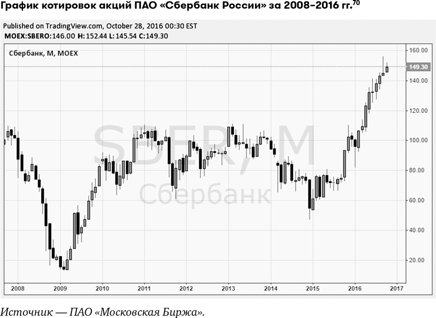 Теперь посмотрим на график котировок акций Сбербанка с 2008 г. до октября 2016 г.