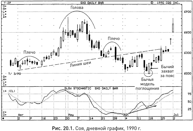 Как видно из рисунка 20.1, 29 мая 1990 г. цены на сою прорвали линию шеи фигуры «голова и плечи» и, следовательно, тренд повернул вниз. Зачастую после прорыва этой линии рынок к ней еще возвращается, прежде чем возобновить падение. В начале второй июньской недели действительно наметился рост – в частности, сессия от 11 июня ознаменовалась появлением сильной белой свечи. Короткая продажа в тот момент была достаточно рискованной: мне нужны были доказательства, что начавшийся подъем не получит продолжения. Первым из них стала свеча с маленьким черным телом, возникшая на следующий день. А 13 июня я рекомендовал открыть по сое короткую позицию по $6,27 со стоп-приказом выше линии шеи на отметке $6,35 и целью движения цены $5,9, которая соответствовала уровню поддержки, образовавшемуся в начале года. Короткая позиция выглядела весьма привлекательной до конца недели, пока продолжалось падение, однако 18 июня рынок возвестил о том, что пора ее ликвидировать. А именно: