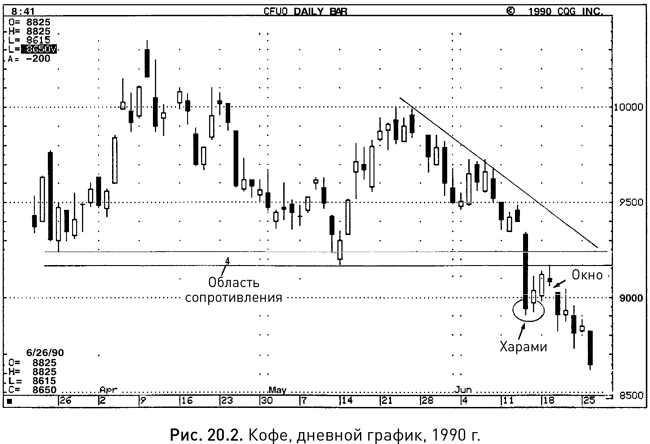 Фьючерс на кофе в конце мая 1990 г. продемонстрировал серию убывающих максимумов, обозначенную на рисунке 20.2 нисходящей линией сопротивления, т. е. основной тренд был направлен вниз. Область поддержки, образовавшаяся еще в конце марта и начале мая, находилась вблизи отметки $0,92. Когда 14 июня медведи ее прорвали, настало время задуматься об открытии короткой позиции, поскольку длинная черная свеча, появившаяся по итогам этой сессии, указывала, что давление с их стороны очень сильное. Тем не менее рынок выглядел чересчур перепроданным, чтобы сразу же приступать к действиям.