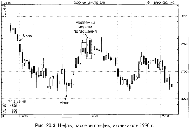 В период, представленный графиком на рисунке 20.3, на рынке нефти господствовала медвежья тенденция, и, следовательно, нужно было открывать короткие позиции при подъемах. Один из таковых начался 21 июня с молота (обратите внимание, что я не стал в данном случае реагировать на него открытием длинной позиции, поскольку основной тренд был нисходящим). Несколькими днями позже одна за другой образовались две медвежьи модели поглощения, и в этот момент я посоветовал начать игру на понижение. Ранее, между сессиями от 15 и 18 июня, открывалось небольшое окно. Полагая, что оно станет зоной сопротивления, я разместил стоп-приказ чуть выше него – на отметке $17,65, а ориентиром для движения цены служила повторная проверка минимумов молота. В ходе подъема в конце сессии от 25 июня цены лишь ненамного превысили область сопротивления, образованную медвежьей моделью поглощения и окном, а затем вновь упали.