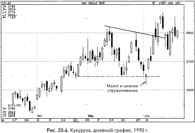 На рисунке 20.4 сессия от 4 июня ознаменовалось появлением молота, при этом цена закрытия оказалась выше $2,65, и, таким образом, минимумы конца апреля – середины мая успешно прошли проверку и устояли. Налицо также было бычье нижнее спружинивание, учитывая, что рынок достигал новых минимумов, но не смог на них удержаться.