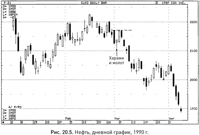 Хотя в ситуации, представленной на рисунке 20.5, мне и не удалось провести прибыльную сделку, она наглядно демонстрирует, что японские свечи помогают находить подходящие точки для входа на рынок и выхода с него. Так, в пятницу 2 марта на свечном графике возникли сигналы к покупке: во-первых, образовался молот, а во-вторых, его короткое тело находилось в границах длинного тела предыдущей свечи, т. е. возникла харами, и это означало, что предыдущий краткосрочный нисходящий тренд подошел к концу. Кроме того, при формировании молота медведи попытались прорвать уровень поддержки, заданный в начале февраля, но не смогли удержать новые минимумы. Значит, пришло время покупать.