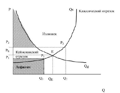 На так называемом кейнсианском отрезке объём национального продукта растёт, а уровень цен не изменяется, ибо экономика находится в состоянии депрессии.