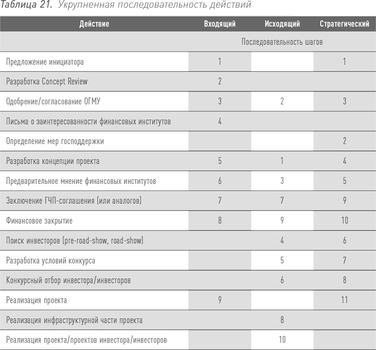 Обратите внимание, что только некоторое количество шагов пересекается. Это связано, например, с тем, что используется принципиально разная последовательность организации привлечения инвесторов: конкурс или без него; развернутый или сокращенный; на чьей стороне утряска вопросов финансирования; многие иные, которые рассмотрены в этой главе далее или в соответствующих разделах.