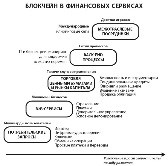 С точки зрения внутренней имплементации, эволюция блокчейна в финансовых услугах будет происходить в соответствии с прогрессивной сегментацией основных областей его применения: