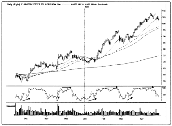 На рис. 9.3 изображен стохастик на дневном графике компании U.S. Steel Corp. (X).